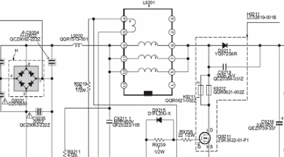 - Tegangan 300v dari diode bridge D9201 diinputkan ke tranfo switching L9201